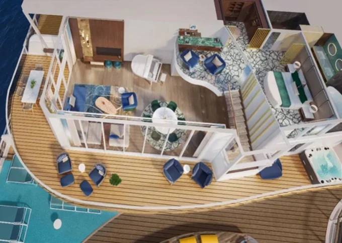 UL - Ultimate Family Townhouse 3-podlažný apartmán. 165 m² + 38 a 23 m² balkóny s výhľadom na more. 7. až 9. paluba vzadu. Max 8 osôb. Výhody Royal Suite Star class. 49 792 € 12 448 € za osobu
