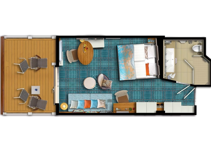 | FVDO - Rodinná kajuta Veranda Deluxe 42 m² + balkón 47 m² so stolom, 4 stoličkami a 2 ležadlami. Hracia konzola. 6. paluba. Max 6 osoby. Cenový model PUR | 3 738 € 1 246 € za osobu |
